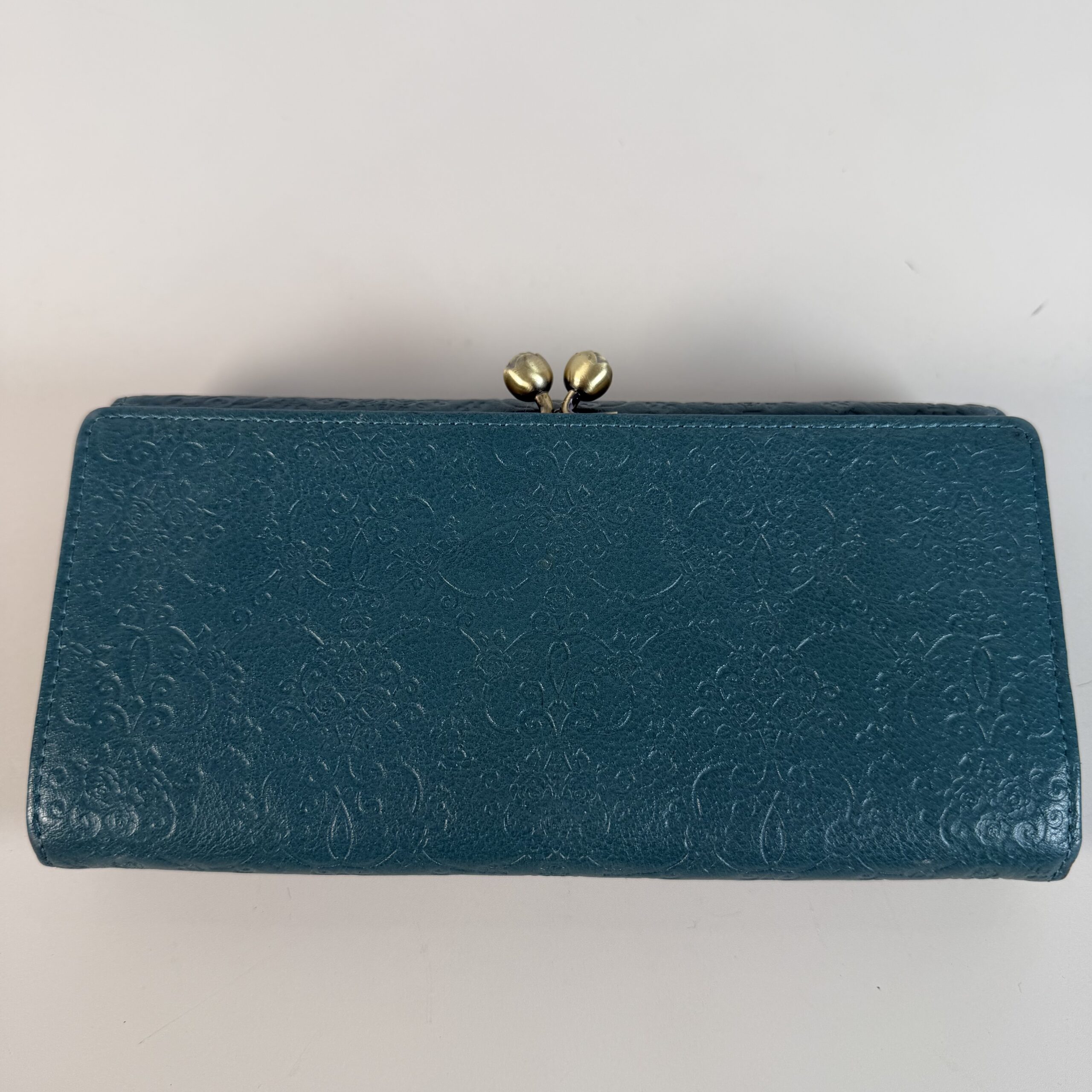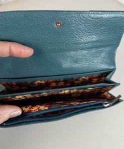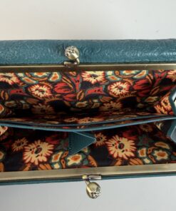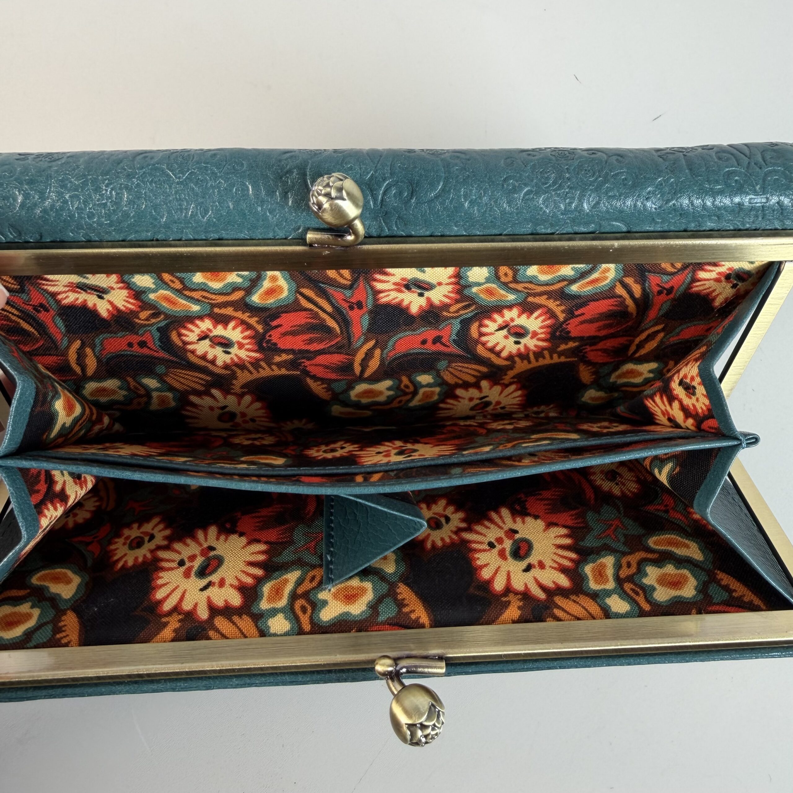 Elevate your accessory collection with this authentic Anna Sui long wallet from the popular Vintage Rose series. Crafted with an exquisite embossed floral/rose pattern, the rich teal (also known as Ivy Green) color is both unique and stylish. The wallet features a distinctive vintage-style clasp (kiss-lock) closure with an ornate logo brooch, and opens to a vibrant, signature Anna Sui floral-patterned interior lining.