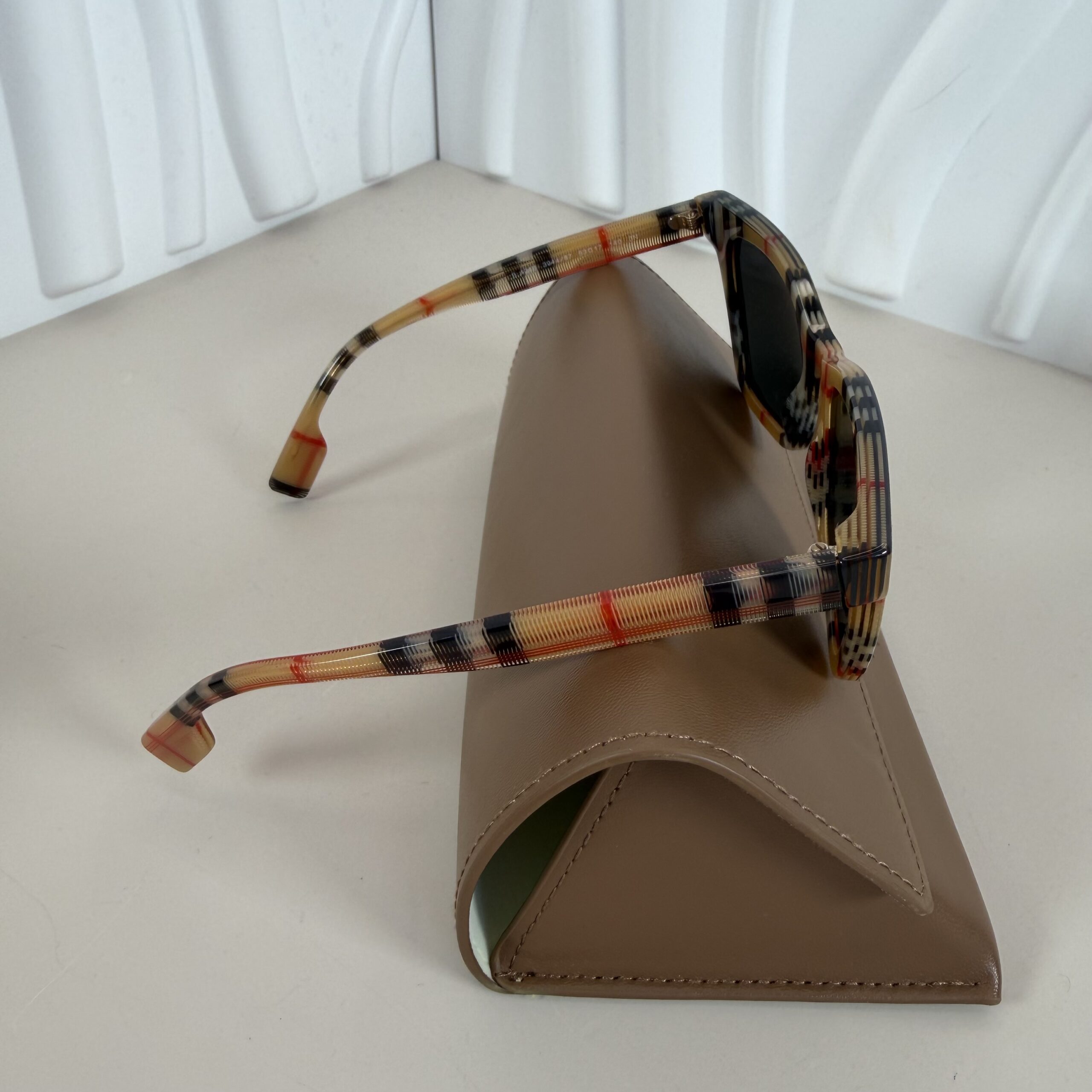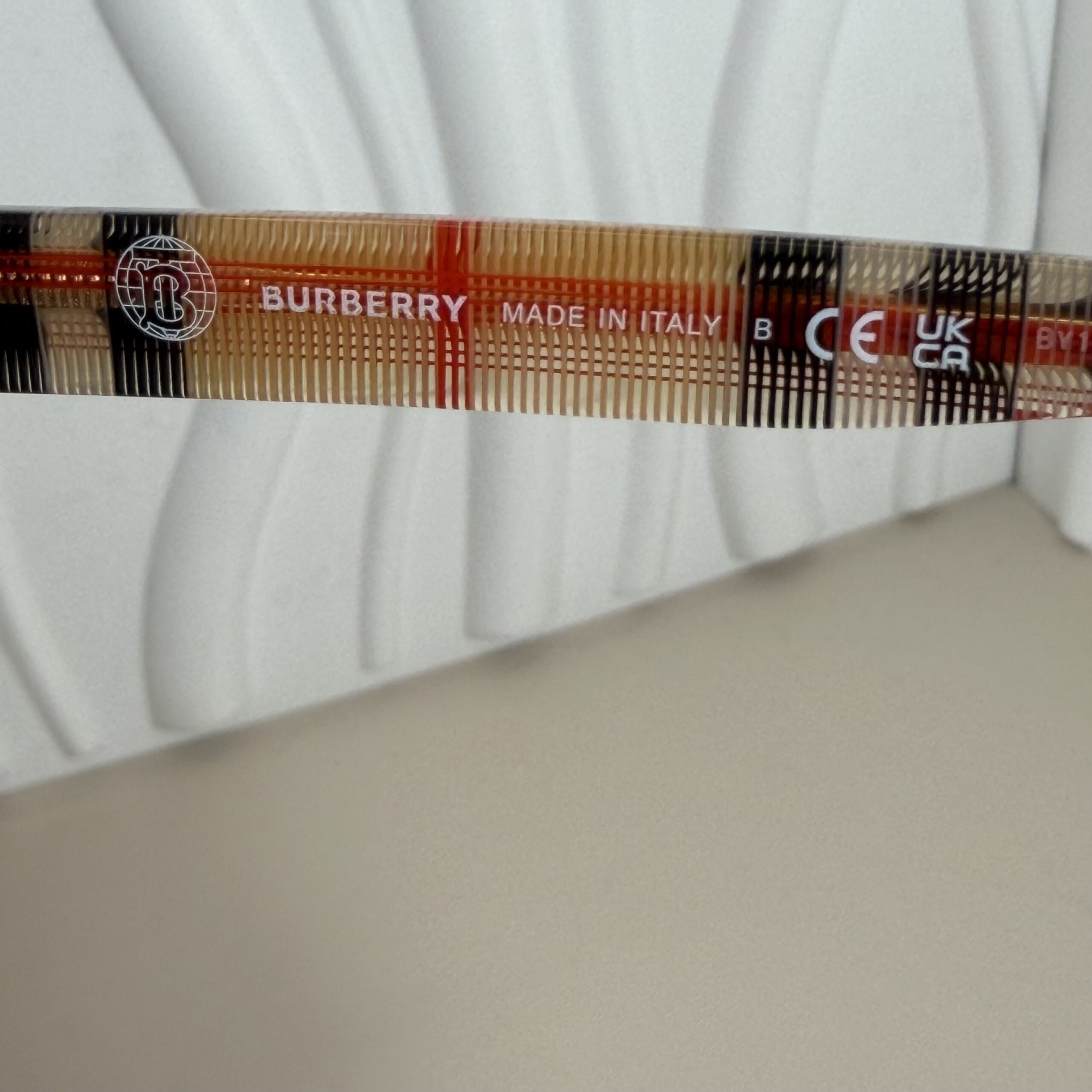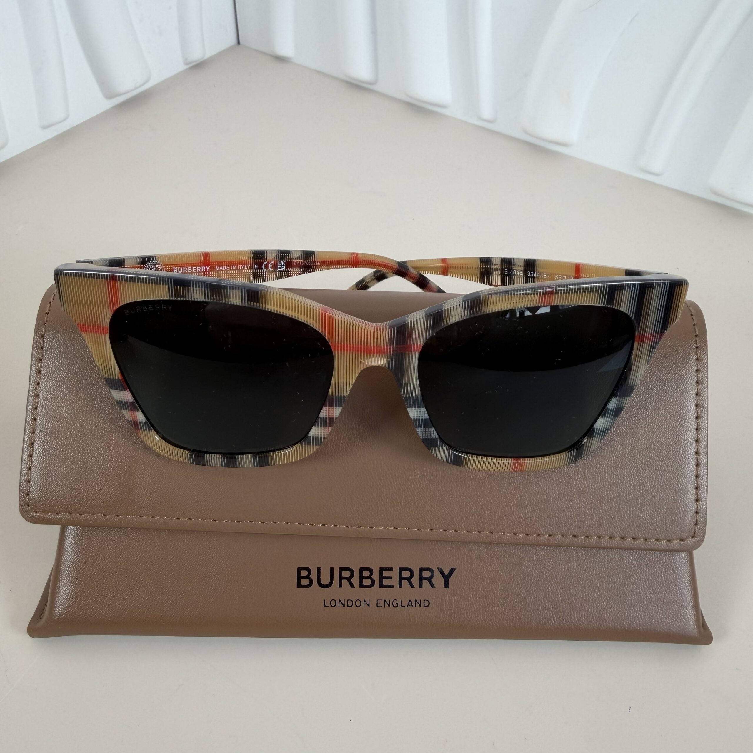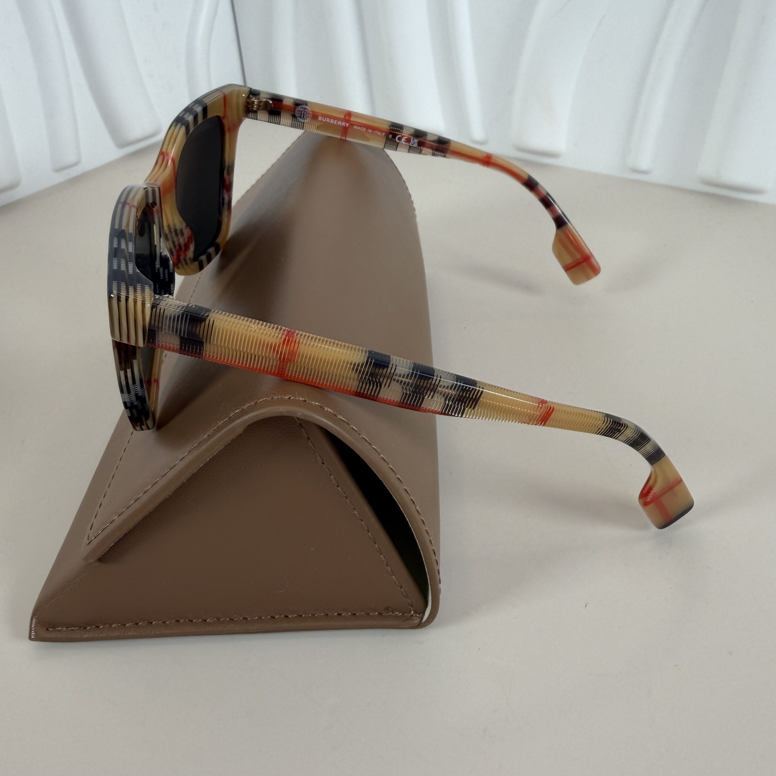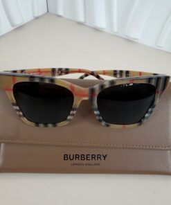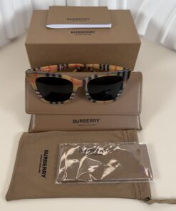 - Frame Details:Â Crafted in durable, lightweight acetate, the frames showcase Burberry’s iconic multicolored Vintage Check pattern in beige, black, and red hues.