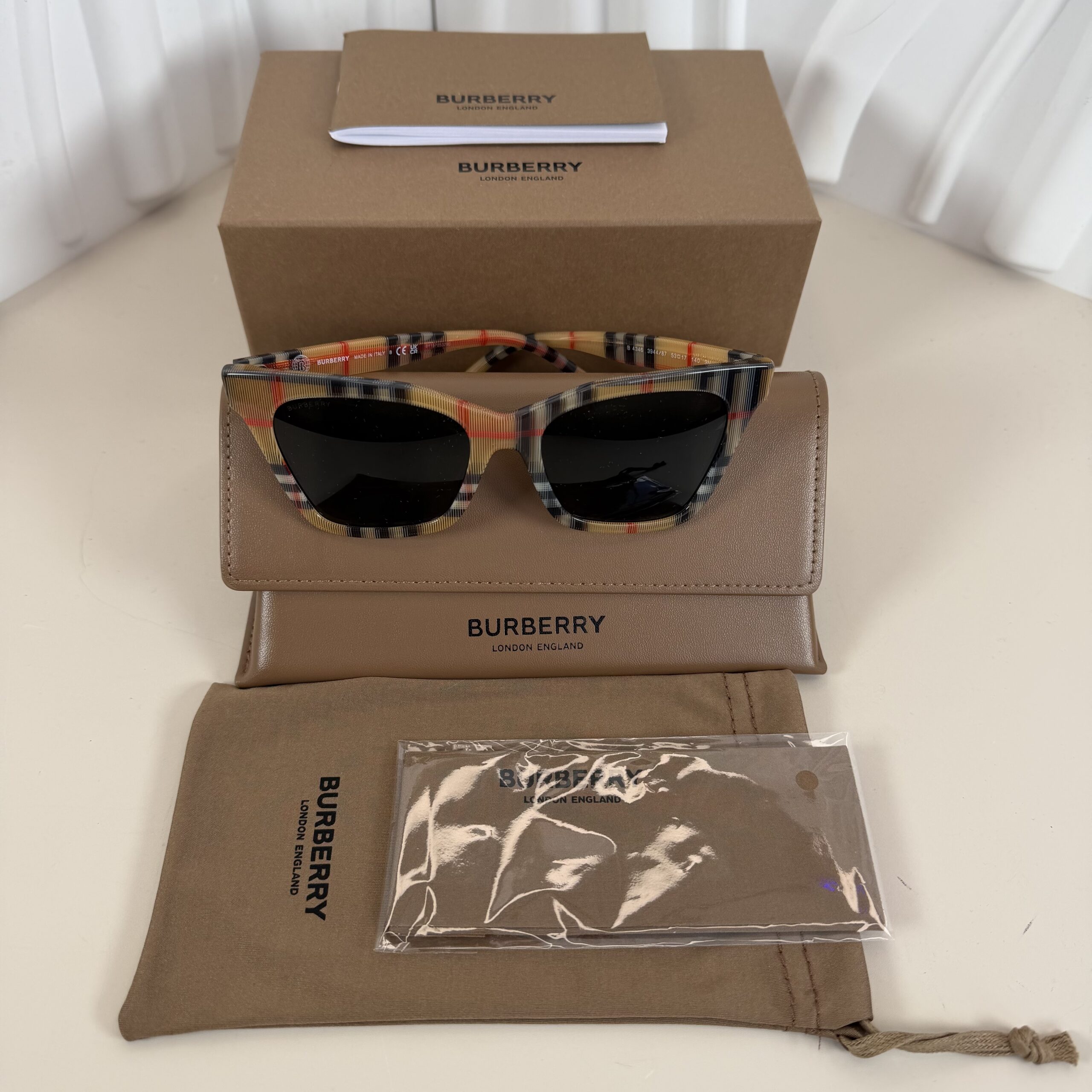 - Accessories: Includes the original tan Burberry box,hard case, soft carry bag and a cleaning cloth, as pictured.