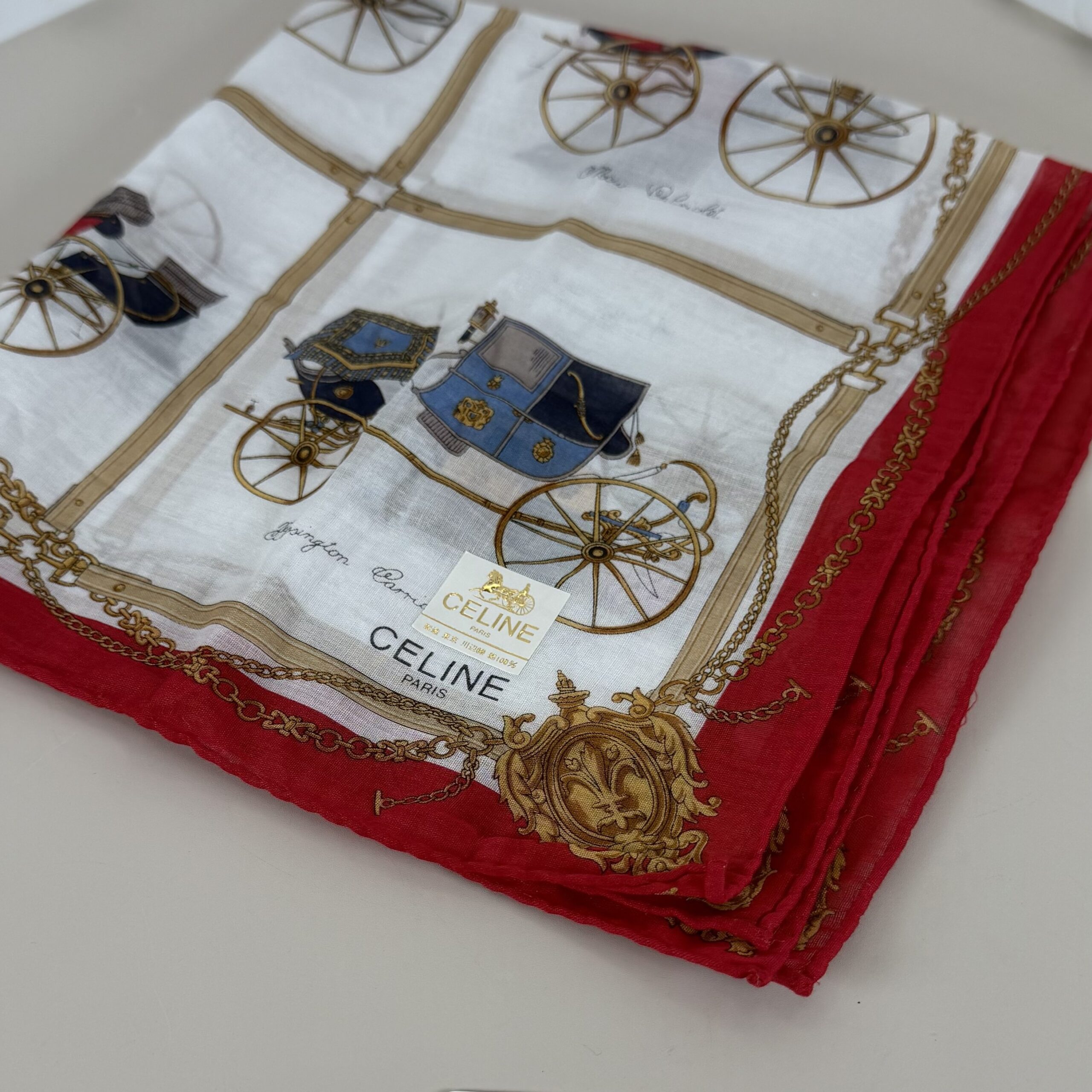 - Design: The scarf showcases nine beautifully illustrated vintage horse-drawn carriages and accessories, framed by intricate gold-tone chains and ornate detailing on a crisp white/cream background. It has a striking red border.