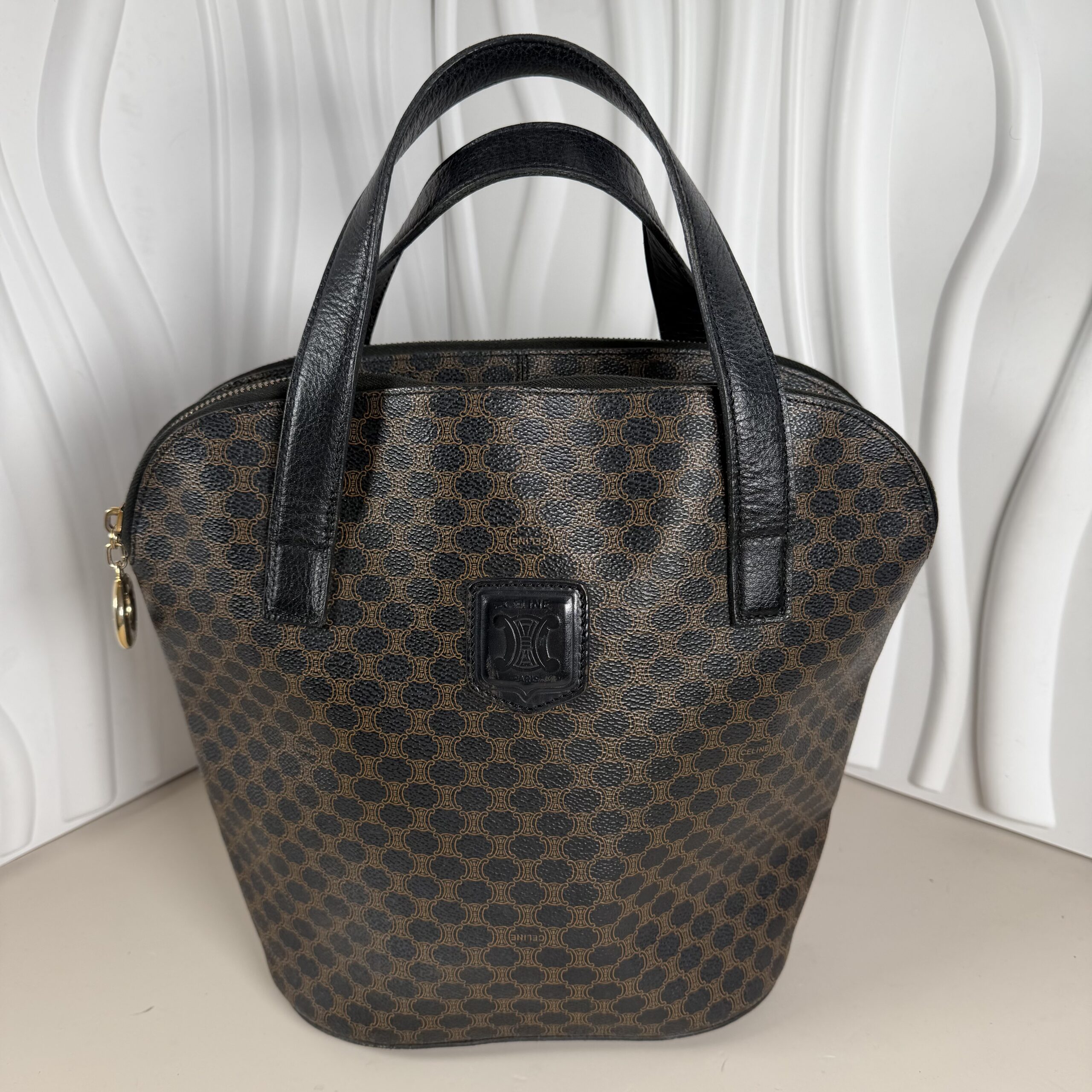 This authentic vintage Celine tote bag features the iconic brown and black Macadam pattern on durable canvas, complemented by elegant black leather trim and handles. The bag is a rare, classic piece of Parisian luxury.
