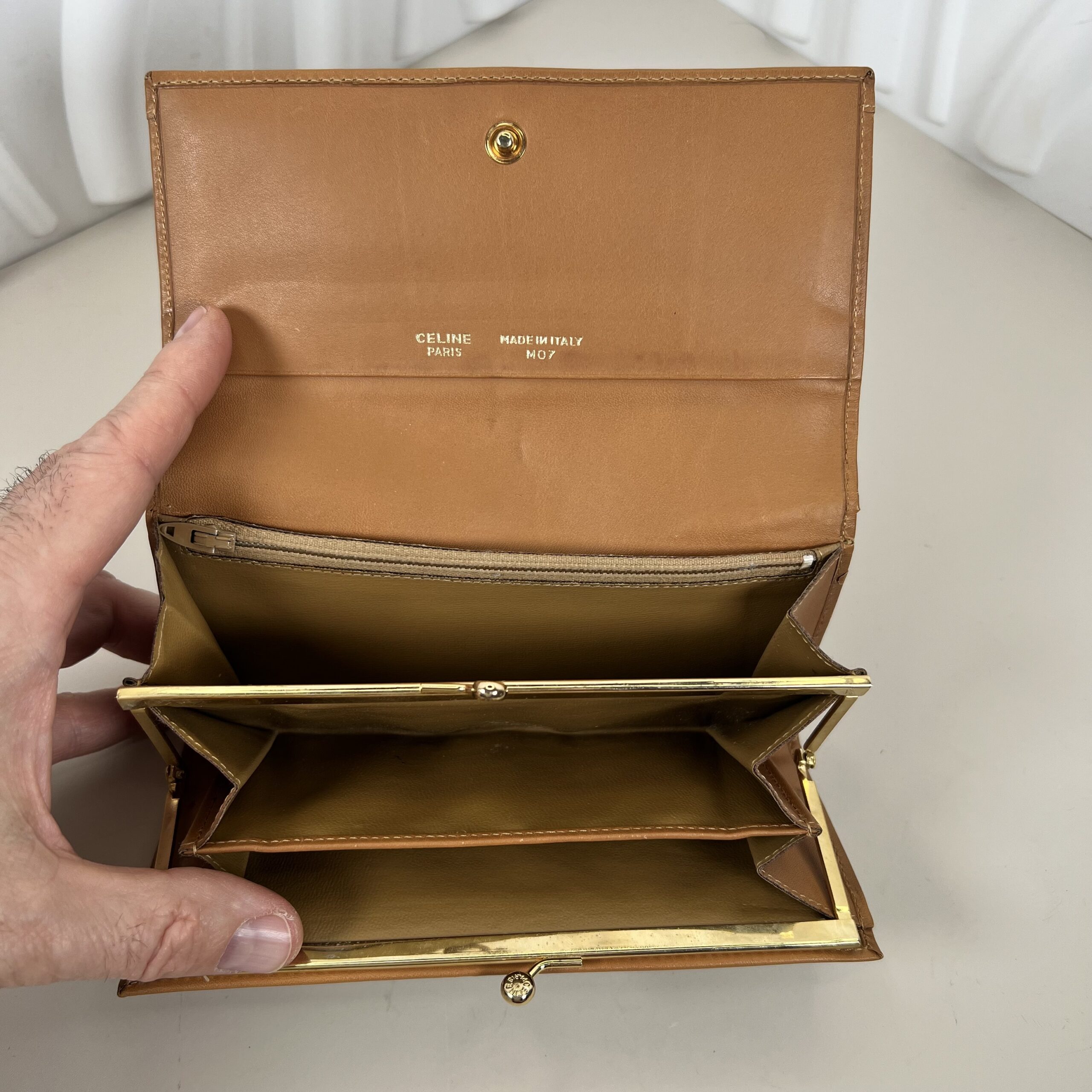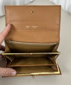 - Interior: The leather interior may show some patina, minor creasing, a few small marks or stains, and potential dirt in the coin compartment consistent with use.