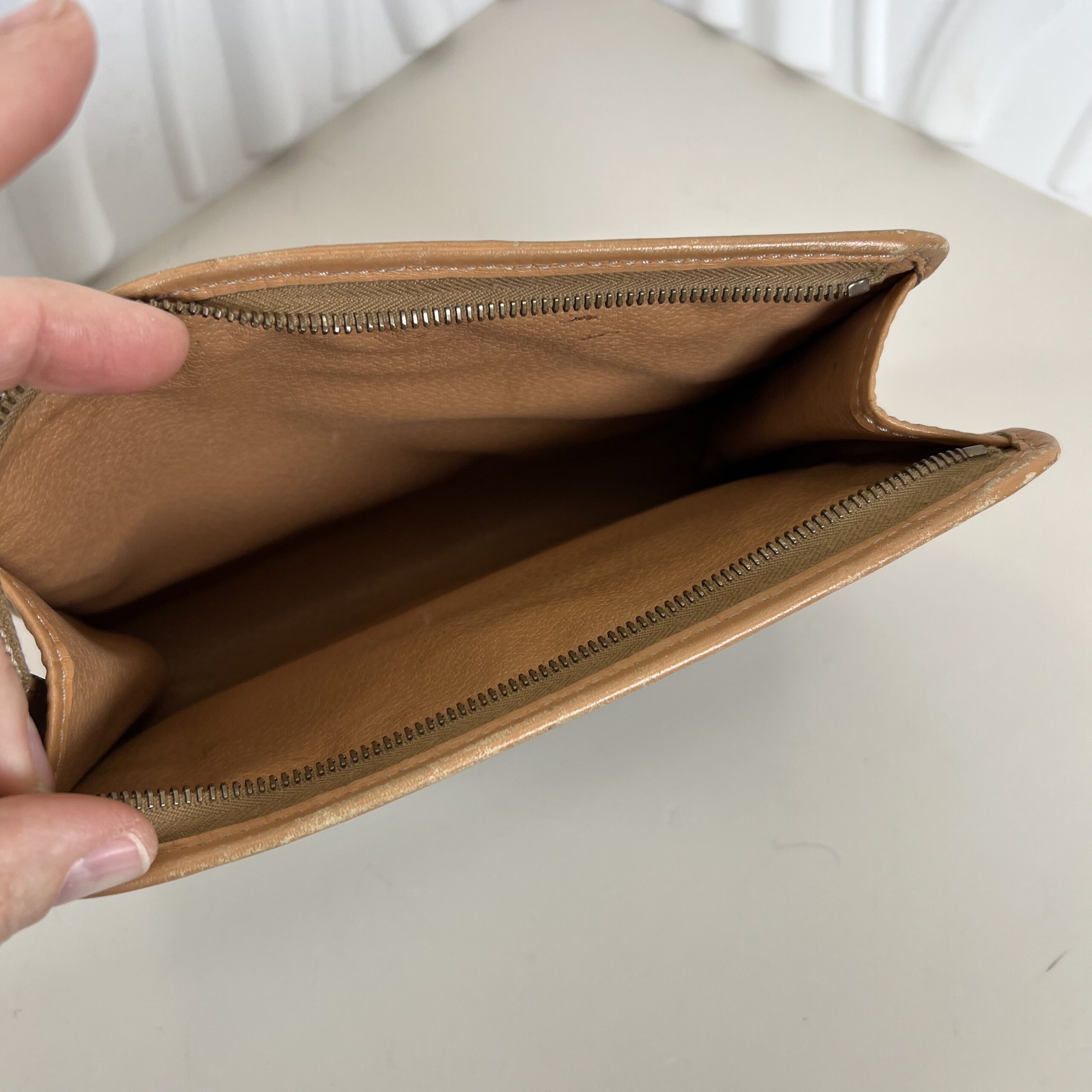 The pouch is finished with natural leather trim along the edges and a matching leather pull tab, adding contrast and structure while reflecting Celine’s refined craftsmanship. A secure top zip closure opens to a spacious interior suitable for essentials, paperwork, or small accessories. This style is commonly identified across resale and collector markets as a Celine Macadam Zip Pouch / Clutch.