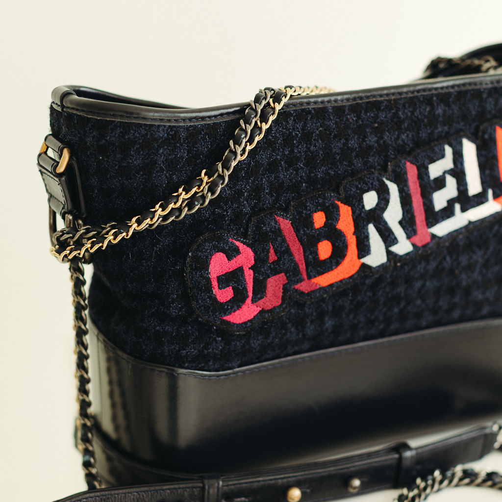 This Chanel Gabrielle Logo Hobo bag is a chic and edgy piece from the 2017–2018 collection. It features a unique blend of navy blue and black quilted tweed on the upper portion, contrasted by a sturdy, smooth black calfskin base.
