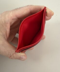 This item is a Christian Louboutin card holder crafted from red leather. It features a distinctive all-over dotted, perforated pattern that forms the brand’s monogram logo across the front. It is made of calfskin leather. The card holder has several slots for cards and one central pocket. The item is in like new condition. See photos for the items condition.
