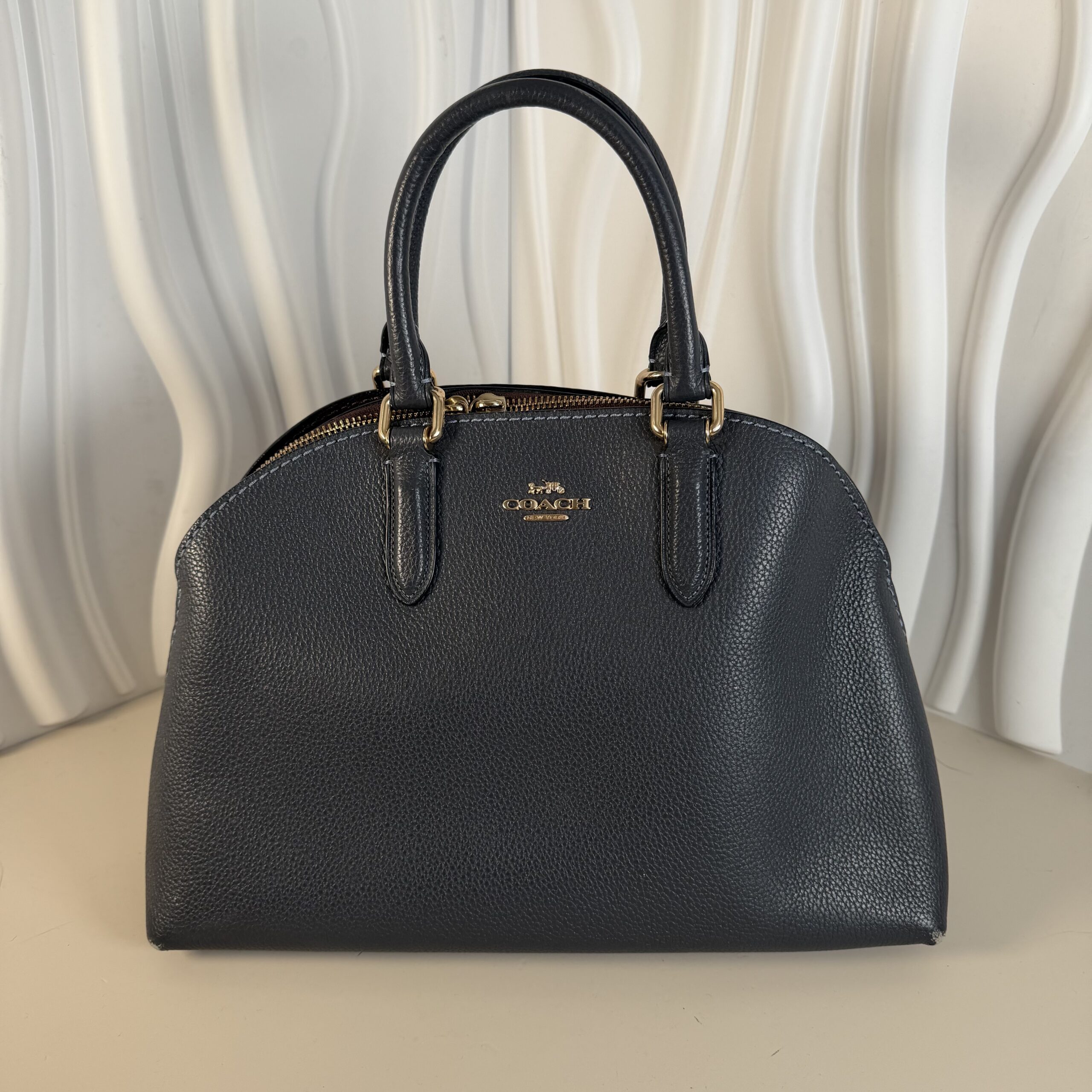 This elegant Coach Quinn satchel, in a beautiful dark blue or grey polished pebble leather with light gold-tone hardware, is the perfect everyday bag. Based on an archival 1960s silhouette, this lightweight, structured, dome-shaped bag offers classic style and excellent organization.