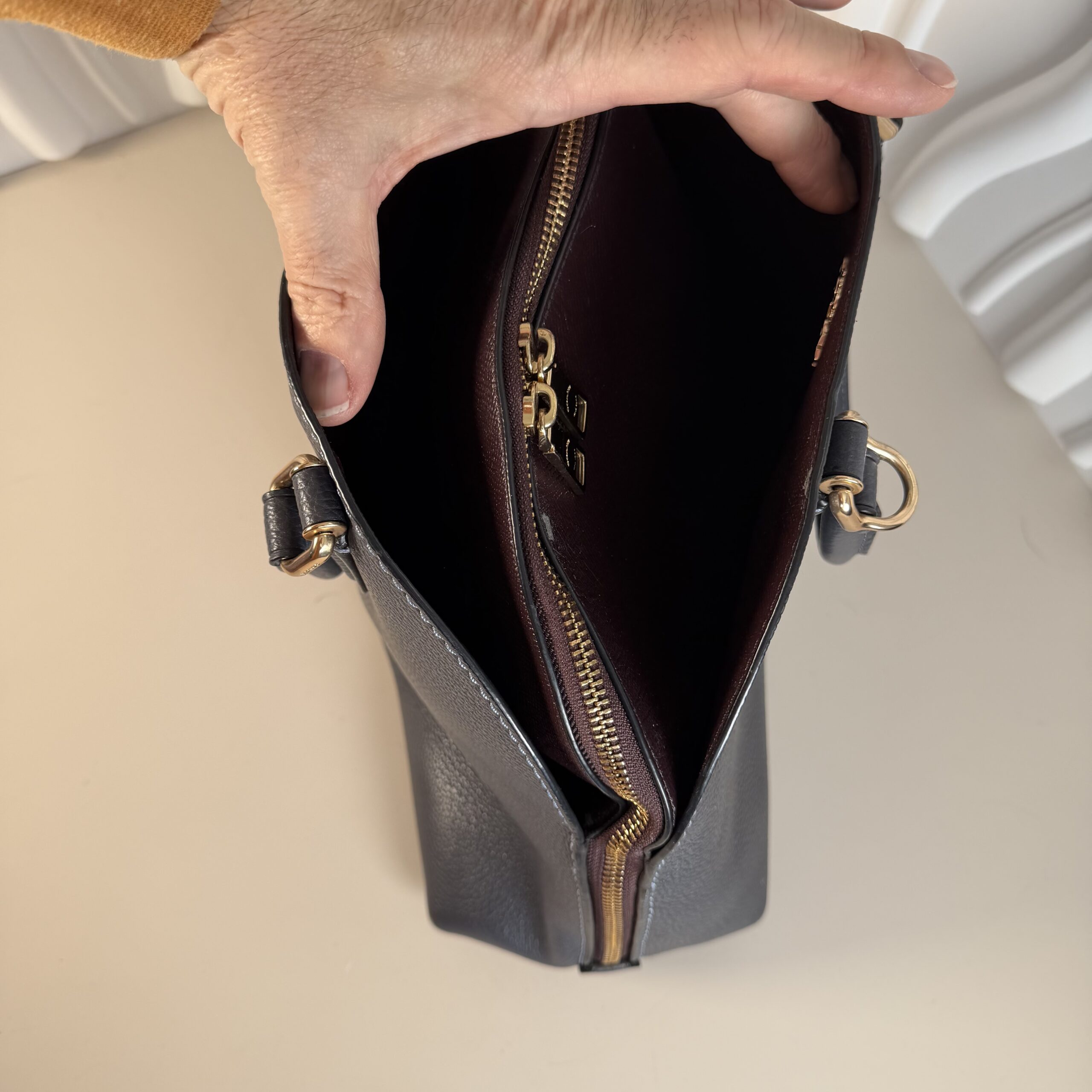 - Color:Â Dark blue/grey exterior (appears blue or dark grey depending on lighting), light gold-tone hardware.