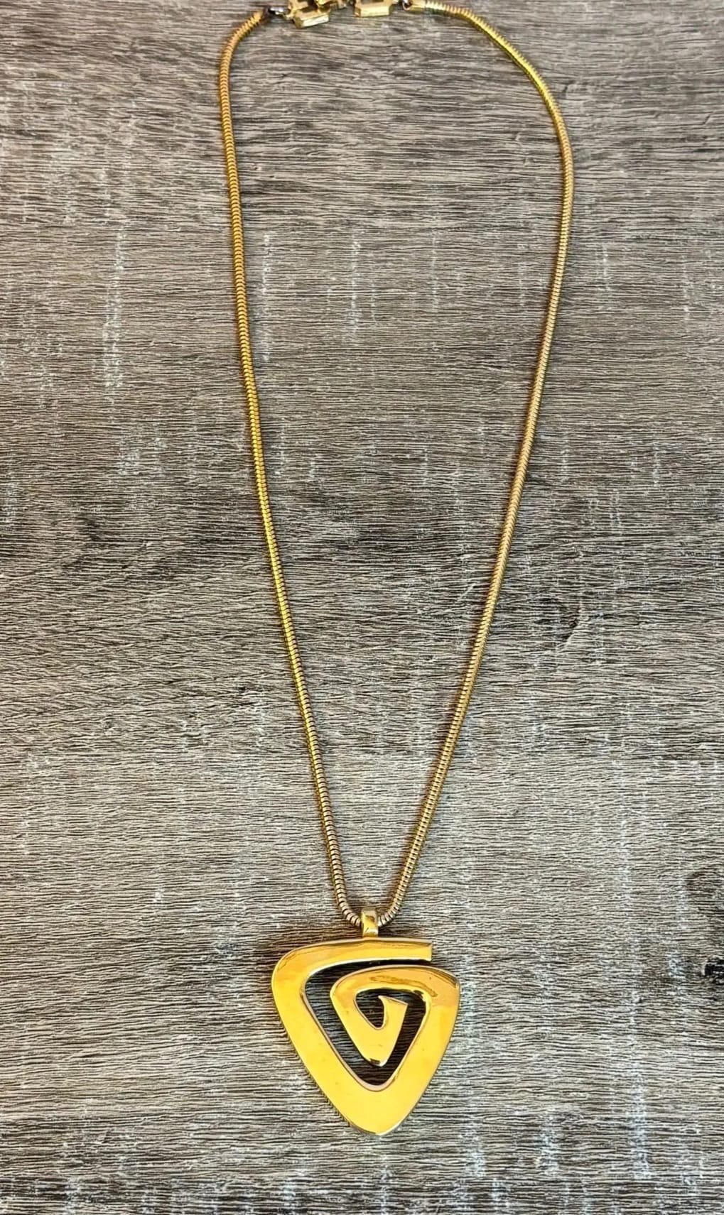 - Description:Â This striking and iconic vintage necklace features a substantial, abstract swirl pendant in a bright gold tone, often associated with the letter ‘G’ logo of the esteemed French fashion house, Givenchy. The bold, geometric design has a modernist or brutalist aesthetic, typical of the 1970s era, making it a true collector’s piece. The pendant hangs from a slinky, smooth snake chain that drapes elegantly when worn.
