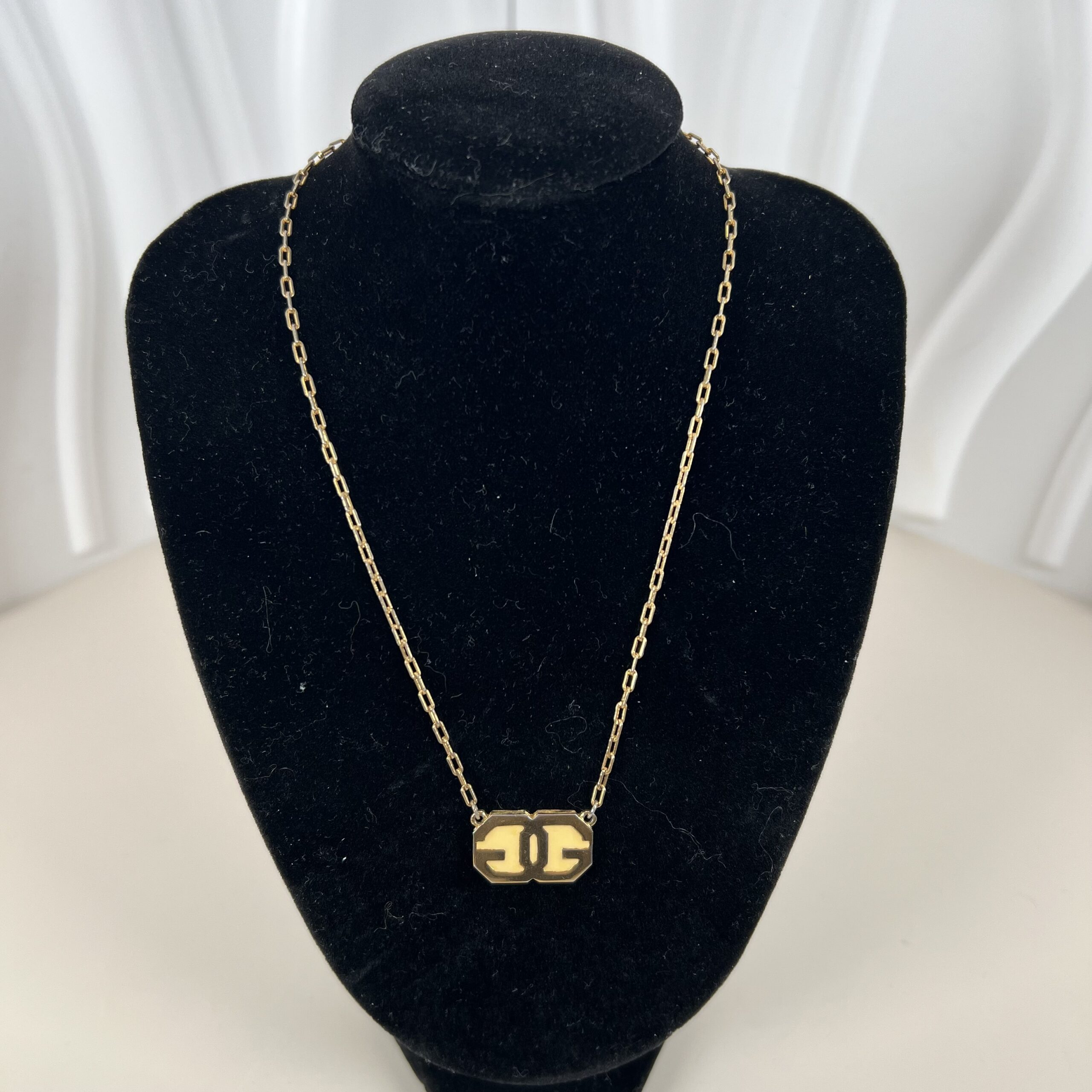 - Design: This elegant vintage necklace features a signature interlocking double G logo pendant with enamel-like detailing in cream/off-white and gold tones. The pendant is fixed on a delicate yet sturdy gold-tone paperclip-style chain with a secure clasp.