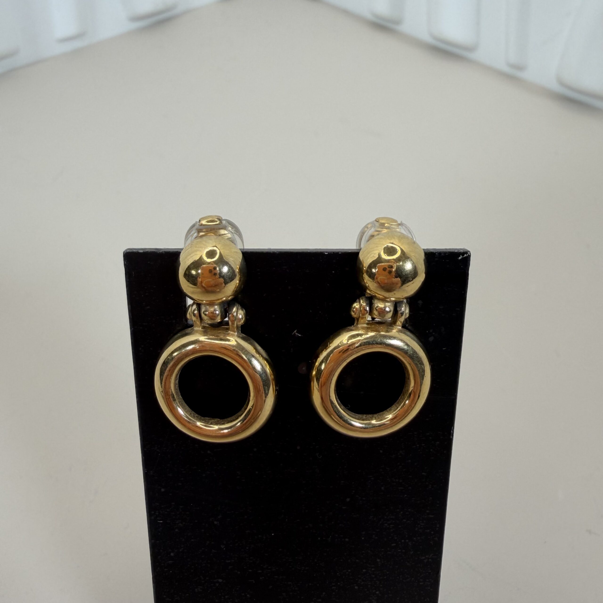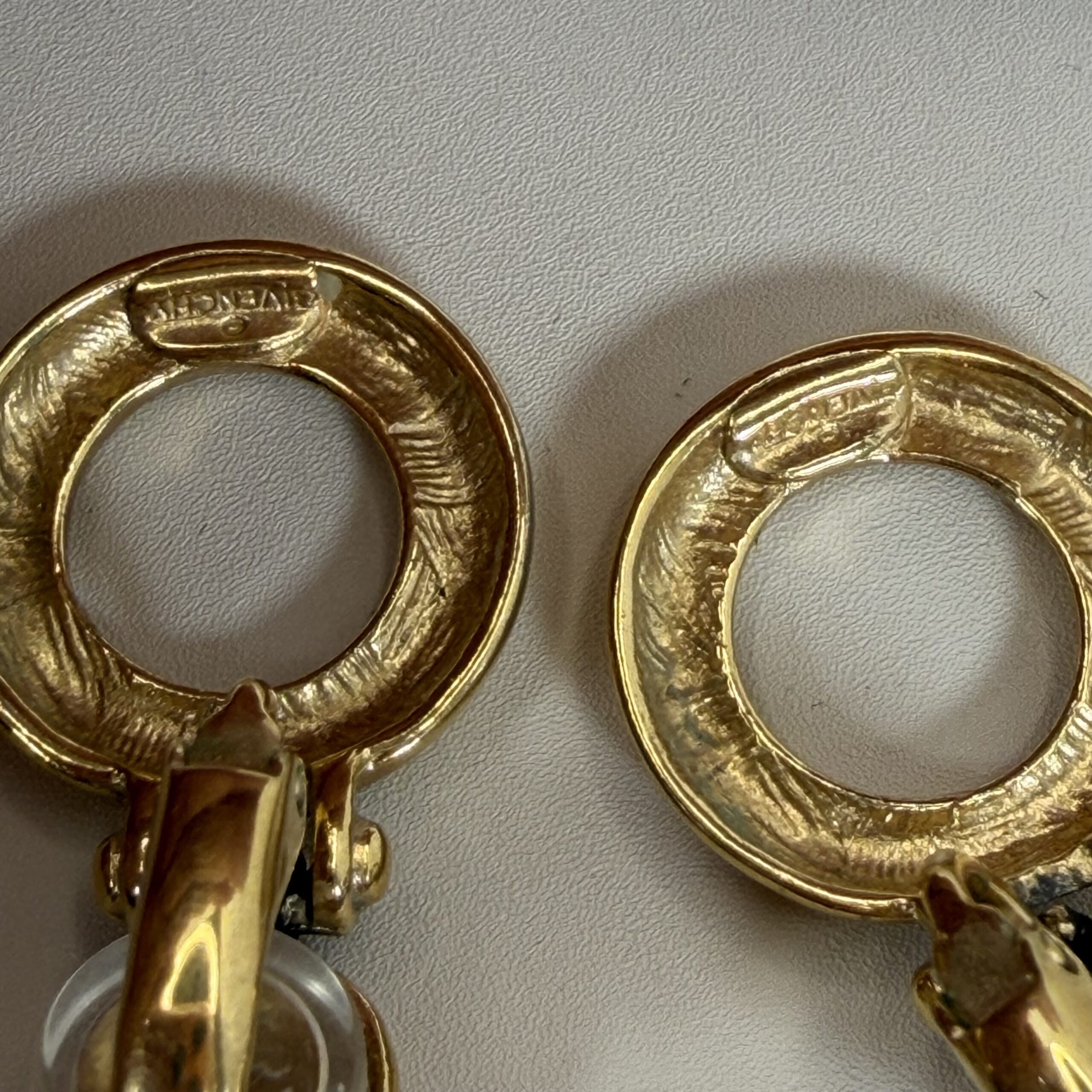 A classic and elegant pair of vintage Givenchy clip-on earrings, likely from the 1980s. These statement pieces feature a polished gold-tone finish with a domed stud and a dangling open circular hoop, often referred to as a “door knocker” style. The design is bold yet timeless, perfect for adding a touch of retro glamour to any outfit.