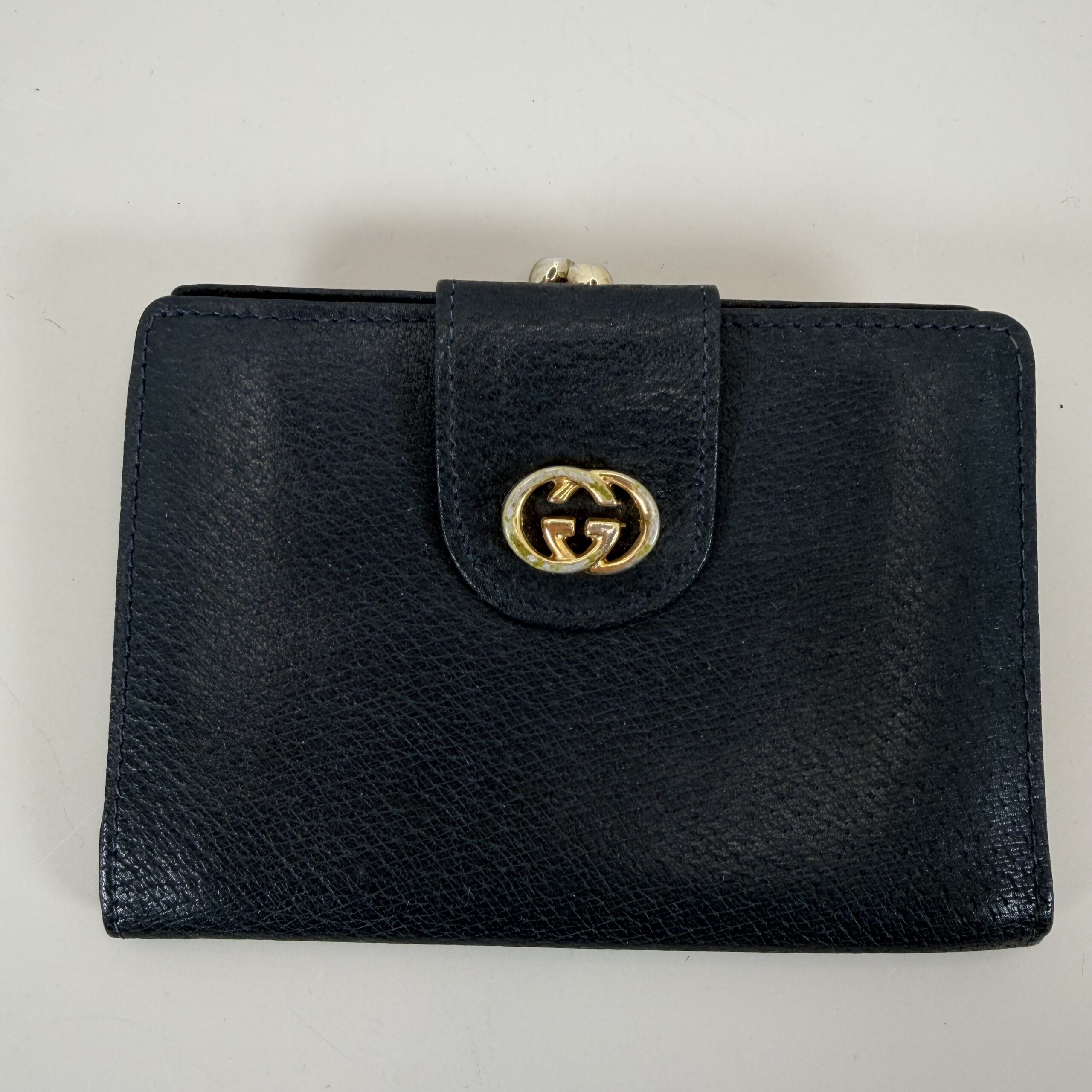 - Hardware:Â The gold-tone hardware, including the GG logo and kiss-lock clasp, shows some slight rub-off of the gold finish in areas (as visible in the photos).