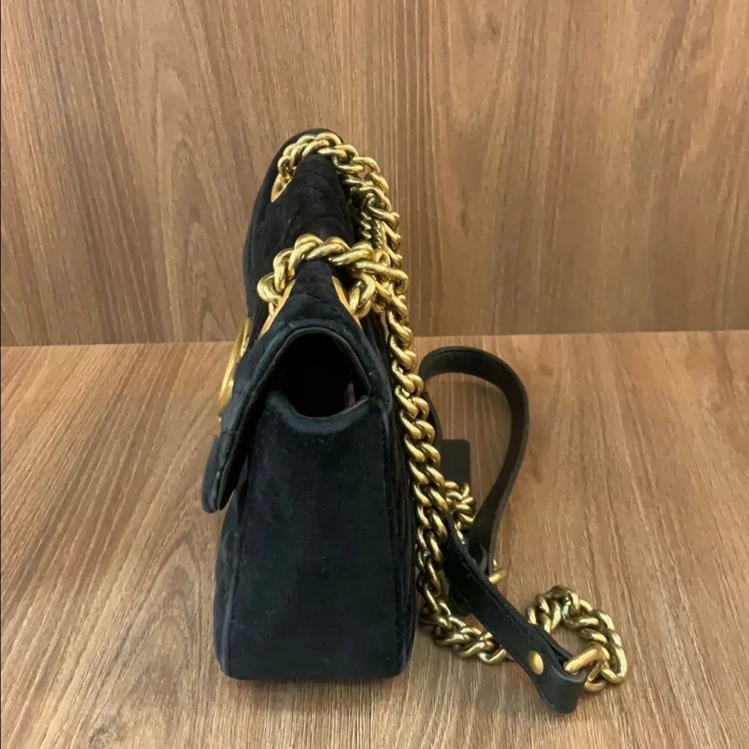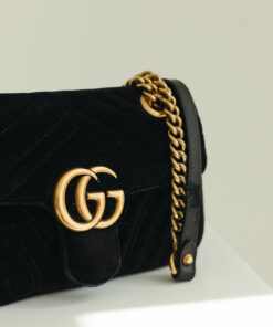 Elevate your collection with this iconic and elegant Gucci GG Marmont bag. Crafted in Italy, this coveted piece features a softly structured silhouette and signature matelassé chevron quilting in plush, black velvet. The timeless design is accentuated by striking, antiqued gold-toned hardware, including the interlocking GG logo on the front flap and the sliding chain strap with a comfortable leather shoulder pad.