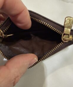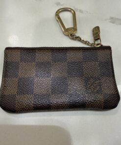 This iconic Louis Vuitton Key Pouch, also known as a Pochette Cles, is crafted from the historic Damier Ebene coated canvas, offering both elegance and utility. It is a versatile accessory that can hold keys, coins, cards, and folded bills, or be clipped as a charm onto a larger bag.