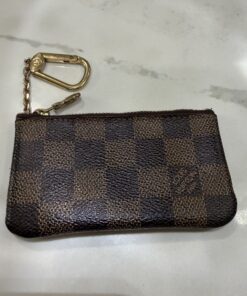 This iconic Louis Vuitton Key Pouch, also known as a Pochette Cles, is crafted from the historic Damier Ebene coated canvas, offering both elegance and utility. It is a versatile accessory that can hold keys, coins, cards, and folded bills, or be clipped as a charm onto a larger bag.