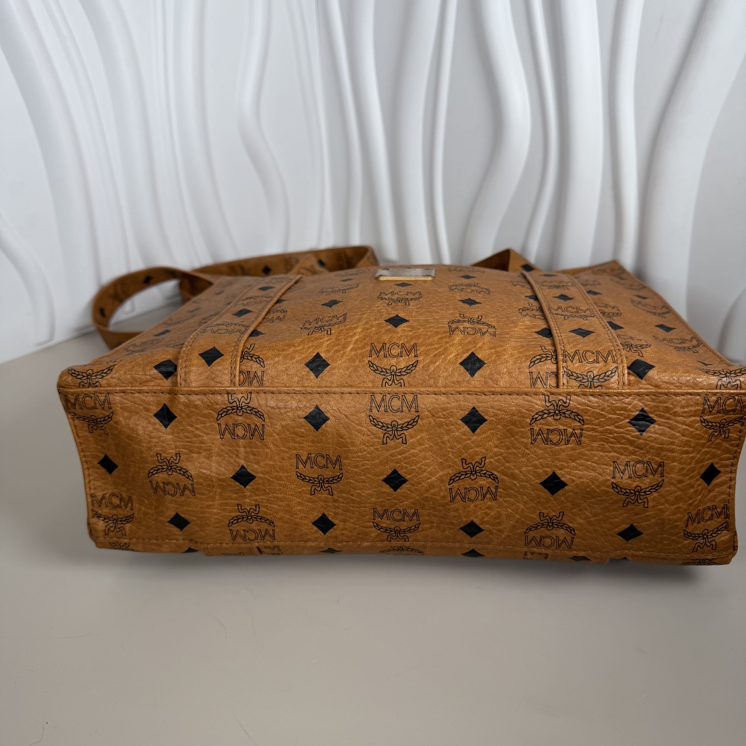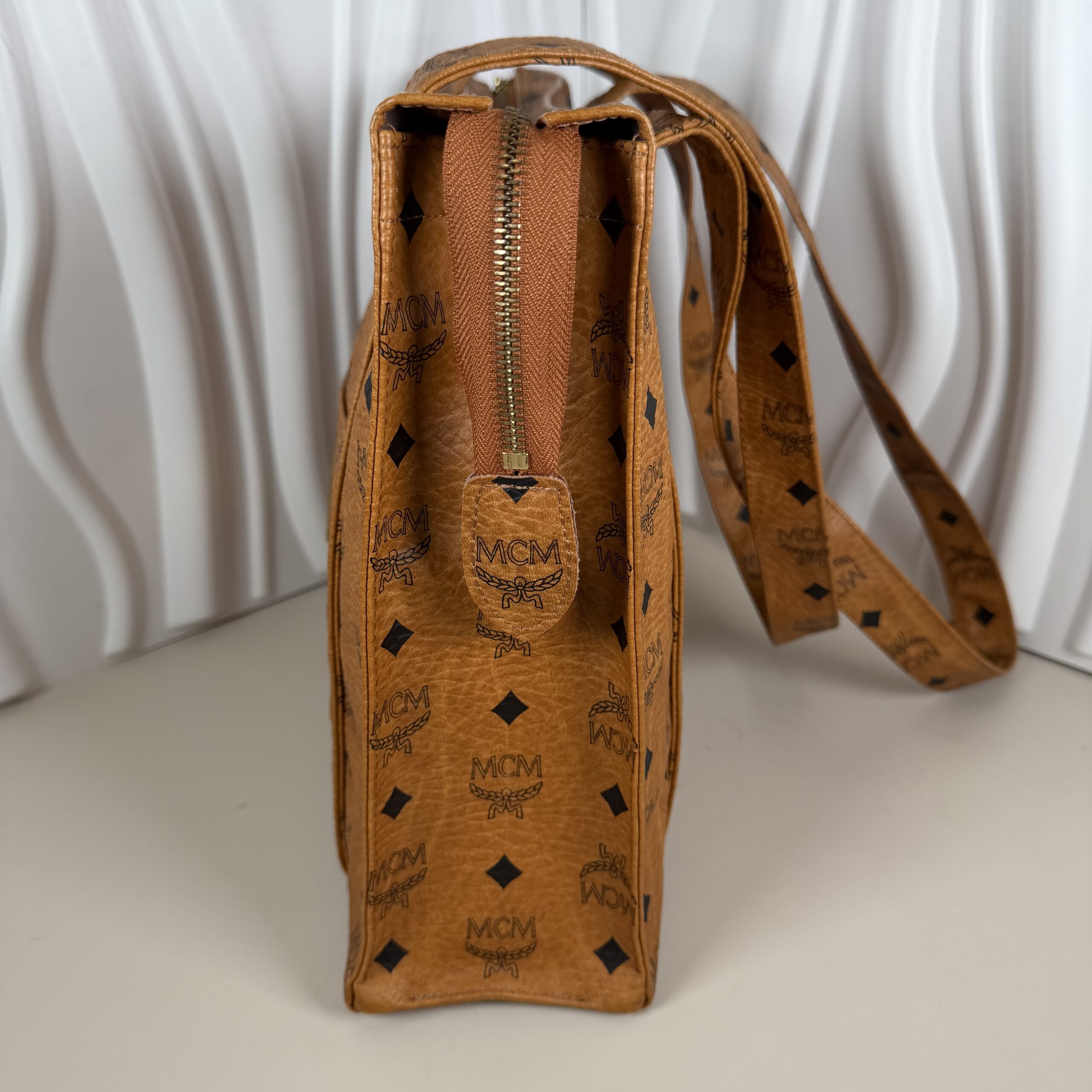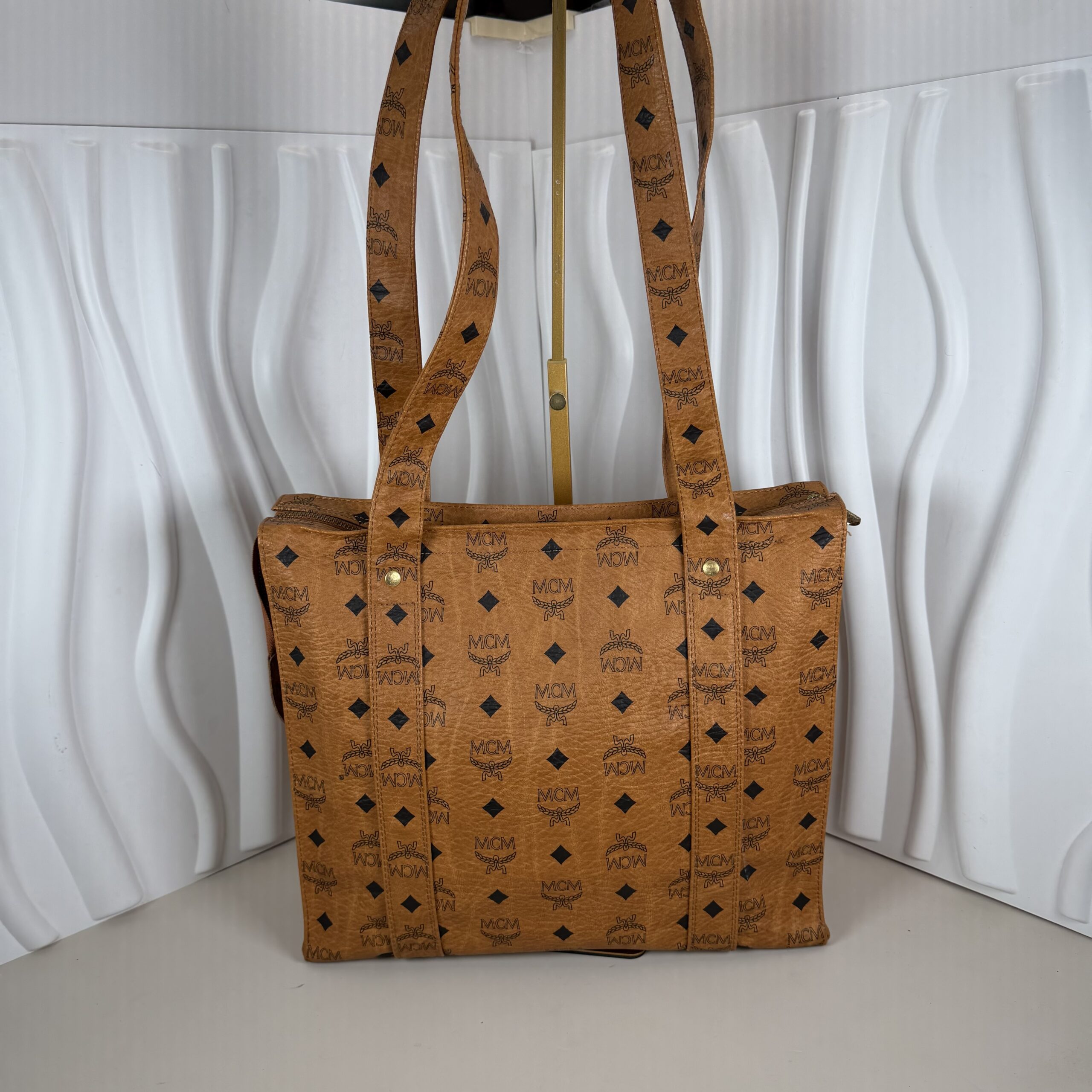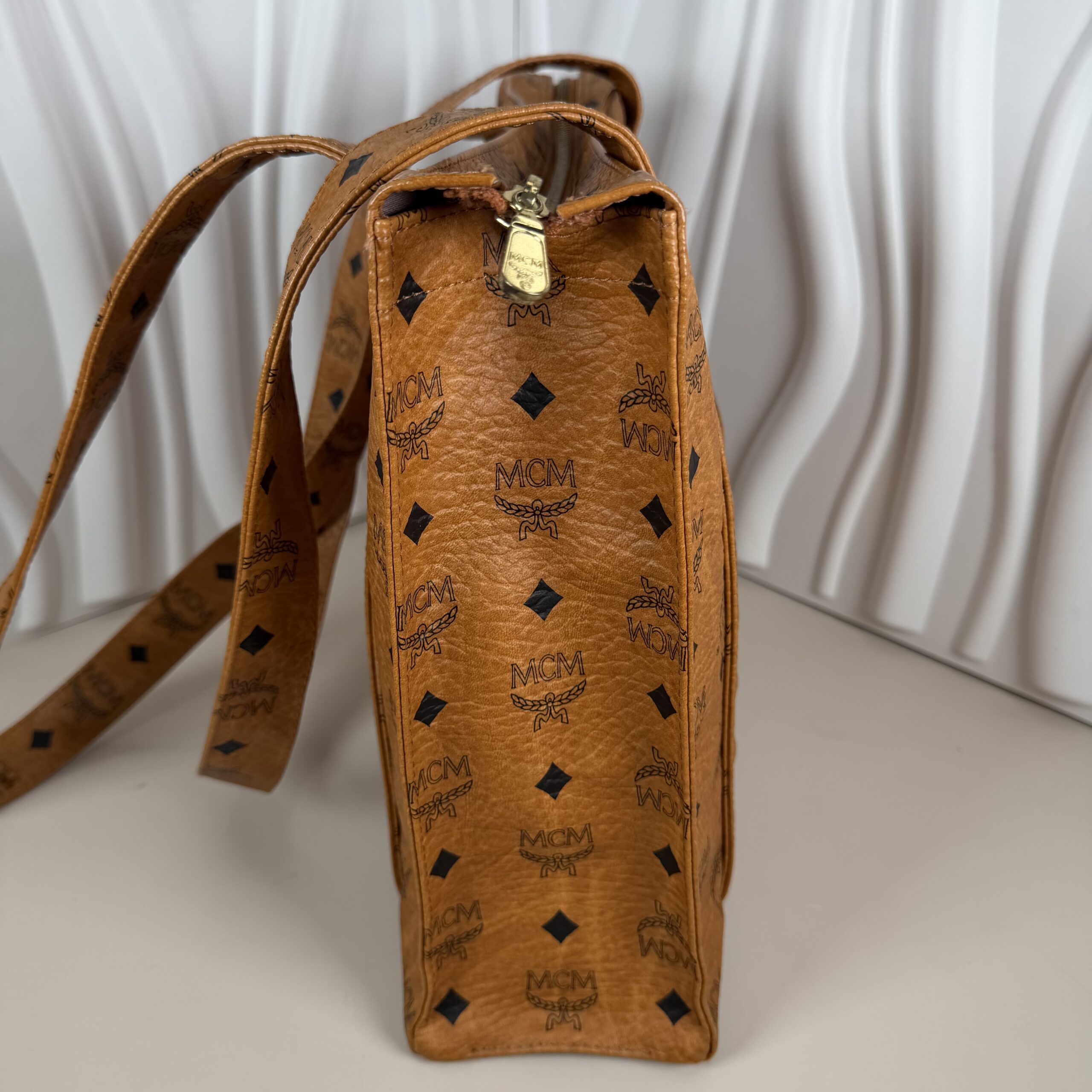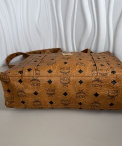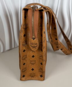 Elevate your everyday style with this iconic piece of luxury from MCM (Modern Creation Munich). This vintage shoulder tote is crafted in the brand’s signature Cognac Visetos coated canvas, featuring the timeless black monogram logo and laurel wreath pattern.