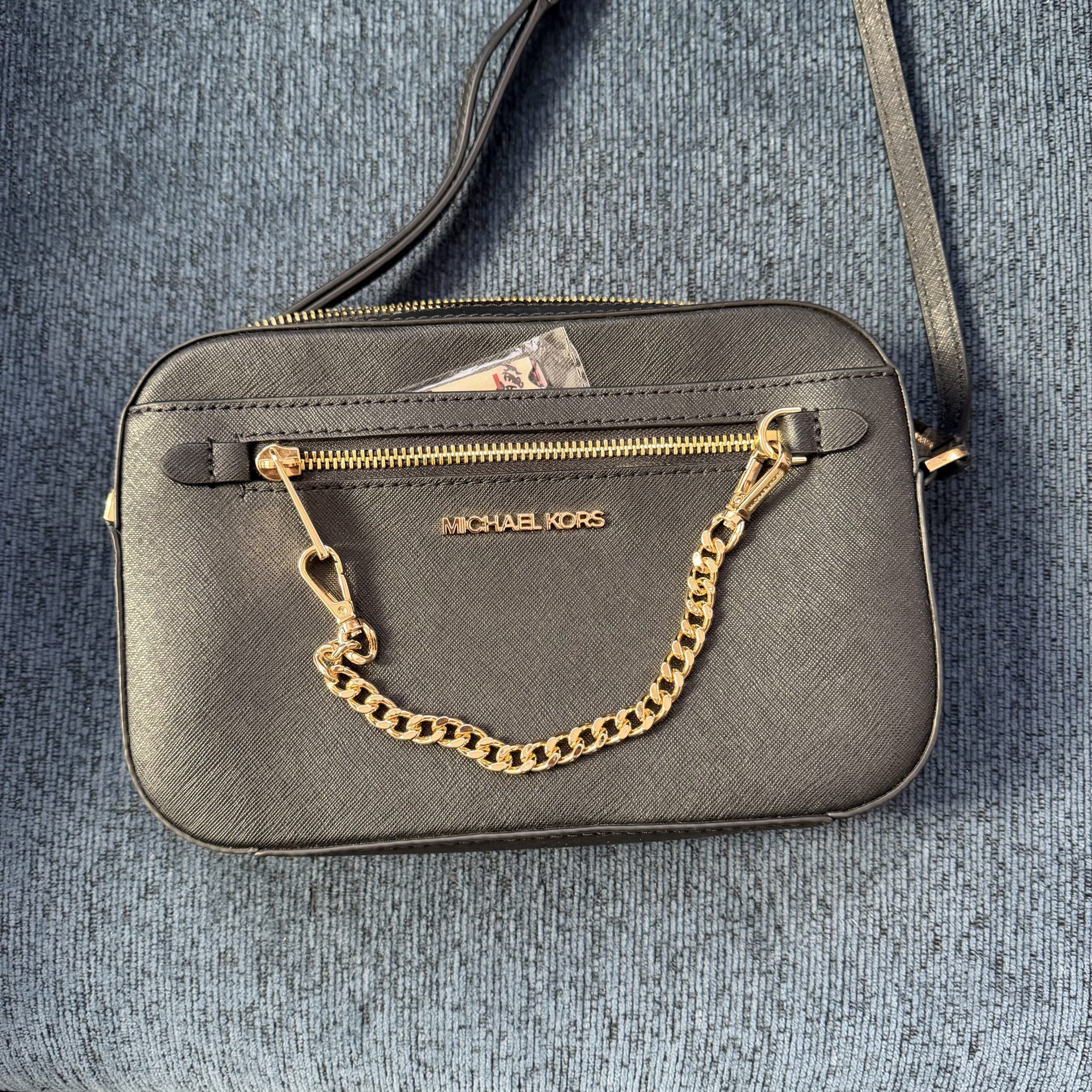 This authentic Michael Kors bag is a stylish and functional accessory perfect for everyday use or travel. Crafted in durable black Saffiano leather with elegant gold-tone hardware, its classic design easily complements any outfit.