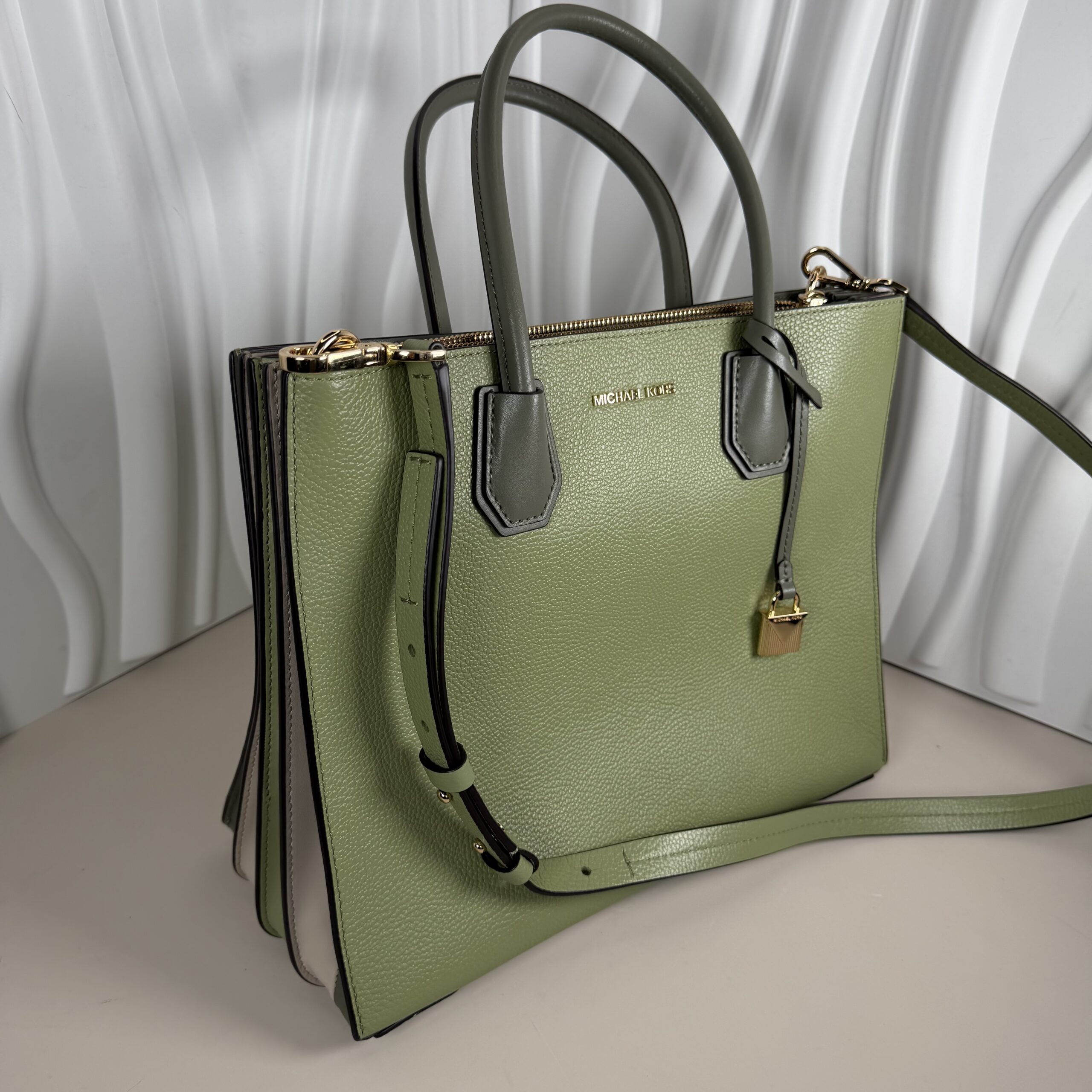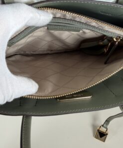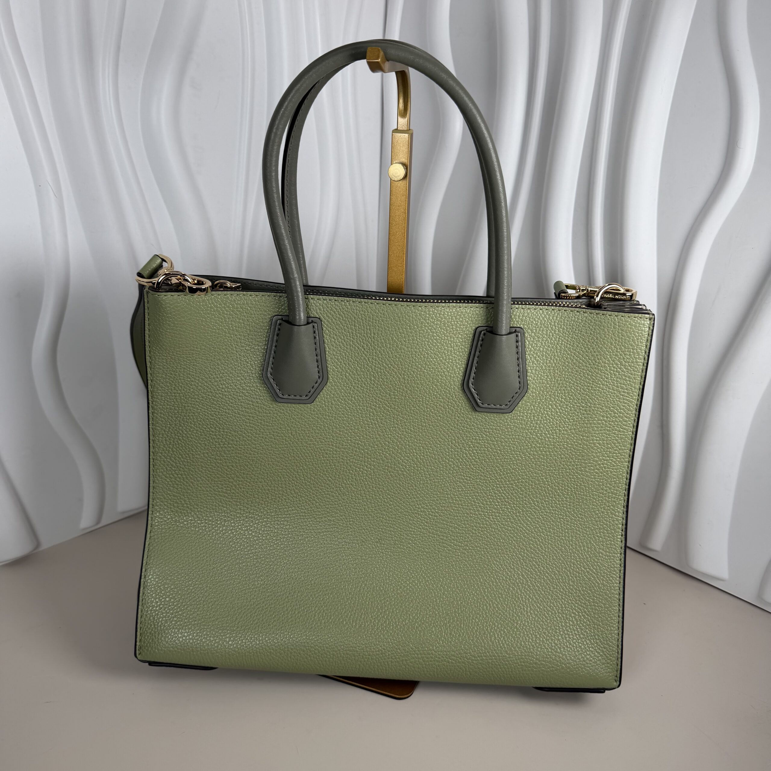 Pre-Owned Authentic Michael Kors Mercer Medium Pebbled Leather Crossbody Bag in the color Light Sage. This versatile satchel is crafted from 100% pebbled leather and features elegant gold-tone hardware