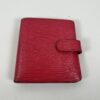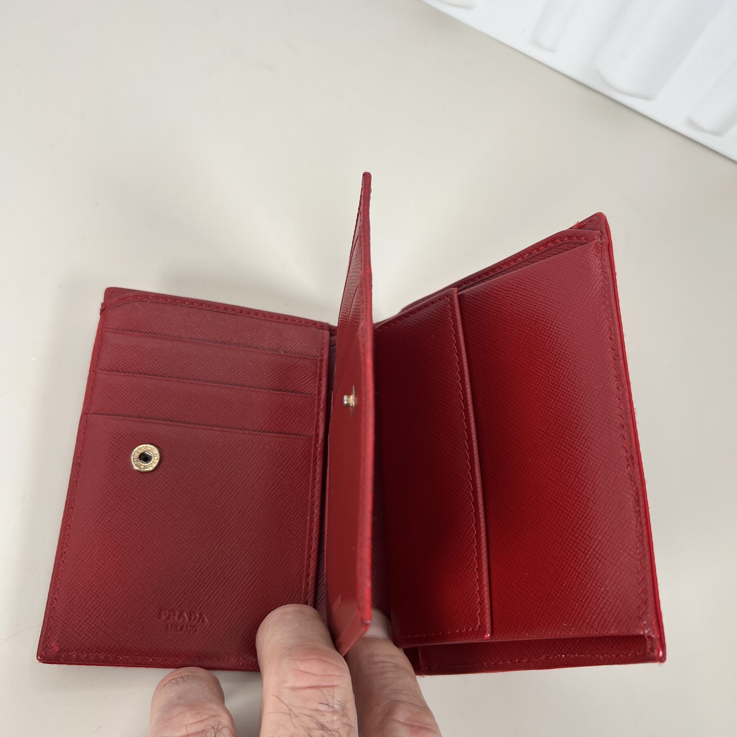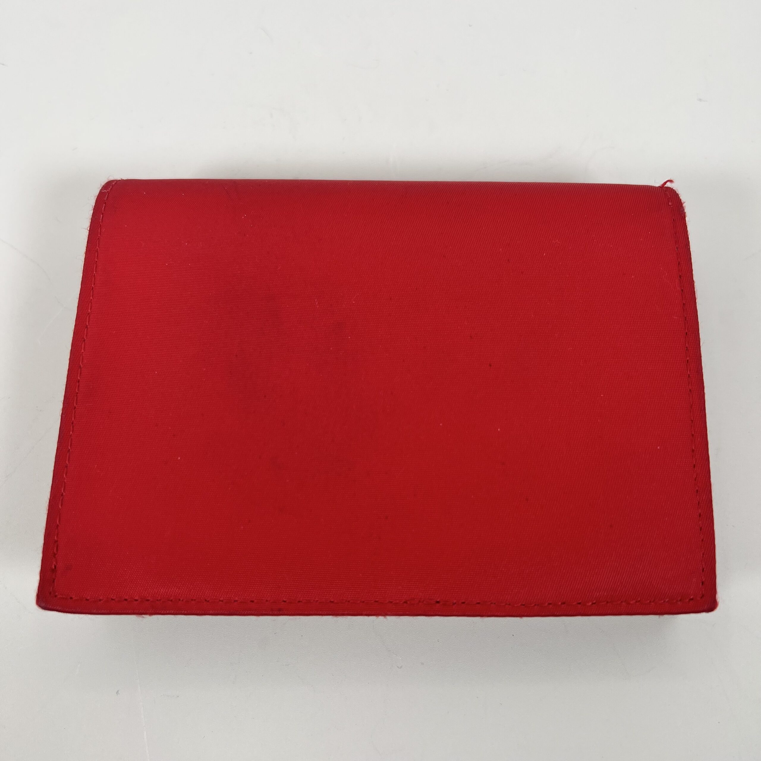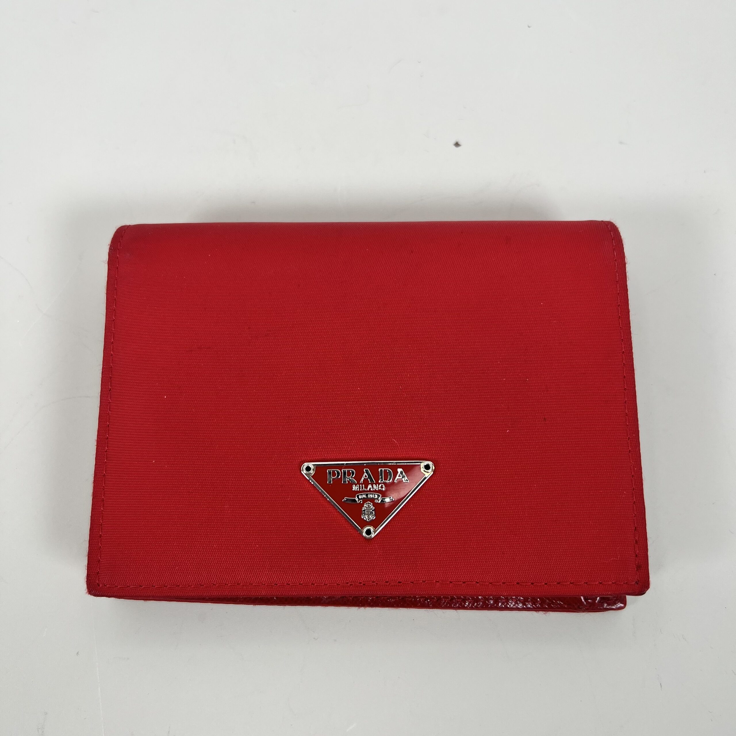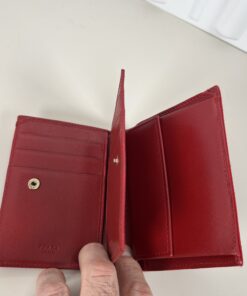 This Prada wallet is crafted from iconic red Saffiano leather and features the signature metal triangle logo on the front flap. Saffiano leather is known for its distinctive crosshatch texture, which makes it durable, scratch-resistant, and easy to clean—perfect for an everyday accessory.