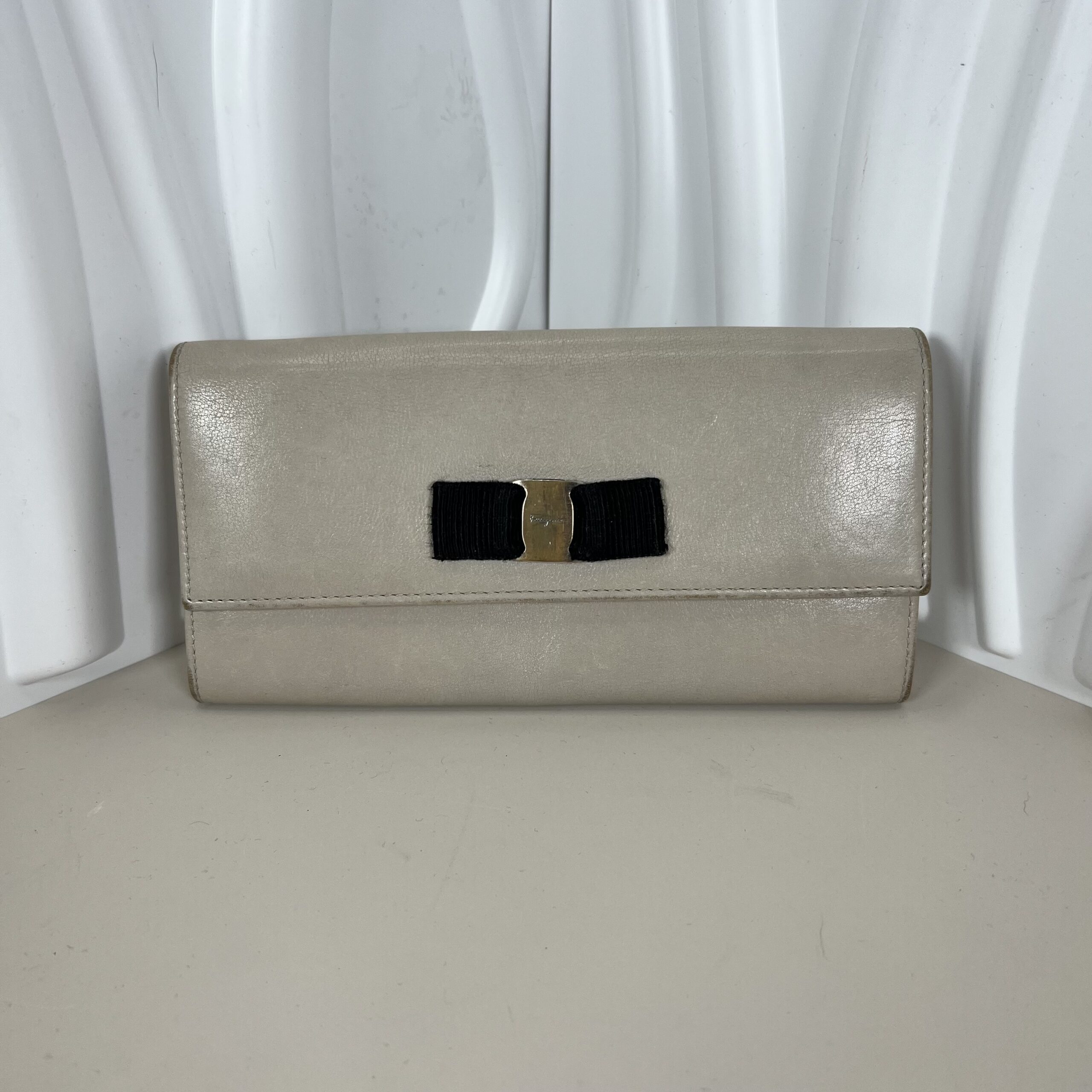 Elevate your style with this , preowned Salvatore Ferragamo continental wallet, a timeless accessory crafted in Italy. This classic piece is rendered in a lovely beige/off-white leather with a signature black grosgrain Vara bow and gold-tone hardware on the front flap.