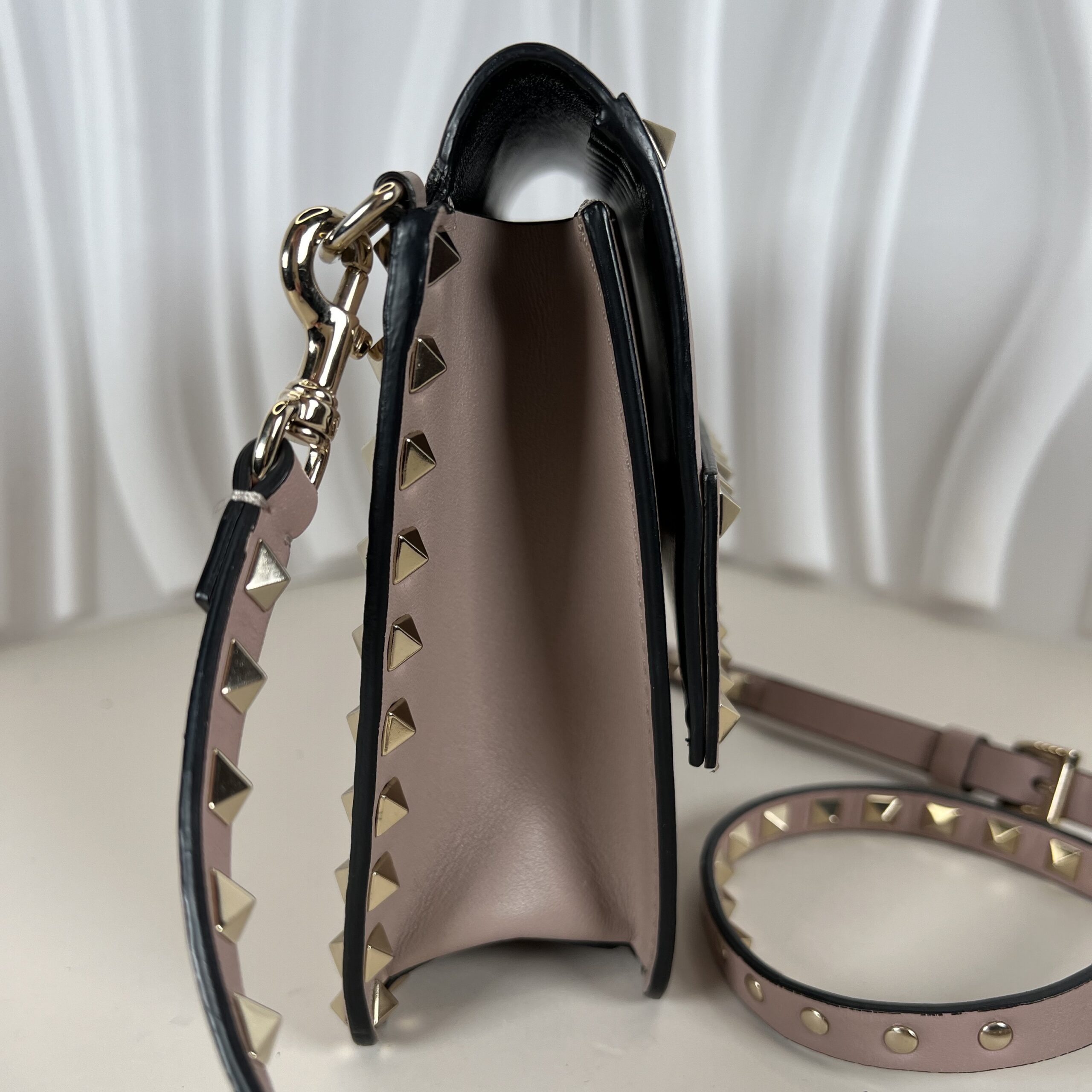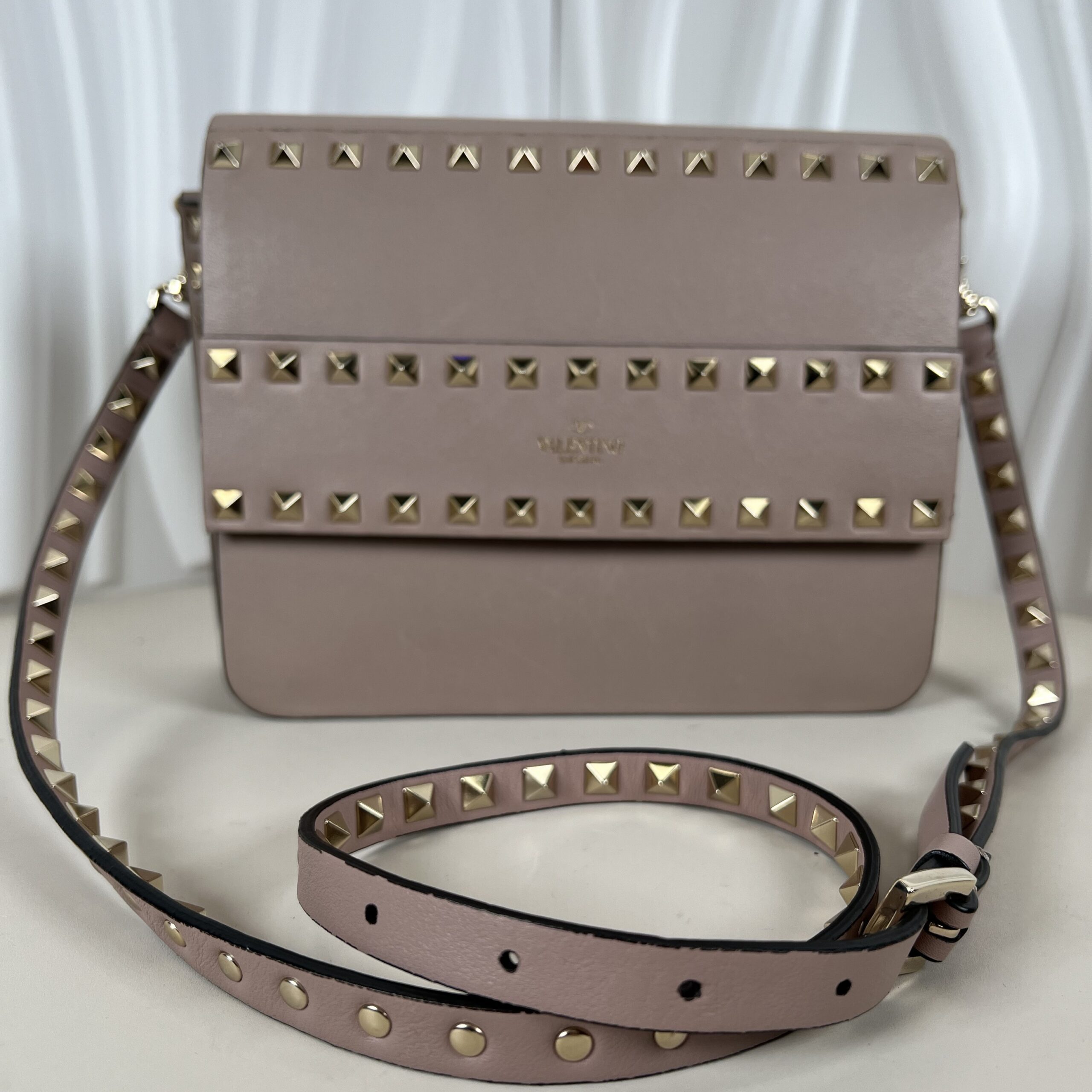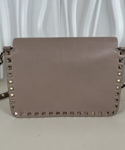 This elegant piece is the Valentino Garavani Rockstud Small Flap Crossbody Bag in the highly coveted Poudre (powder pink/beige) shade. Crafted in Italy from luxurious grained calfskin leather, it features the iconic platinum-finish pyramid studs that define the Rockstud collection.