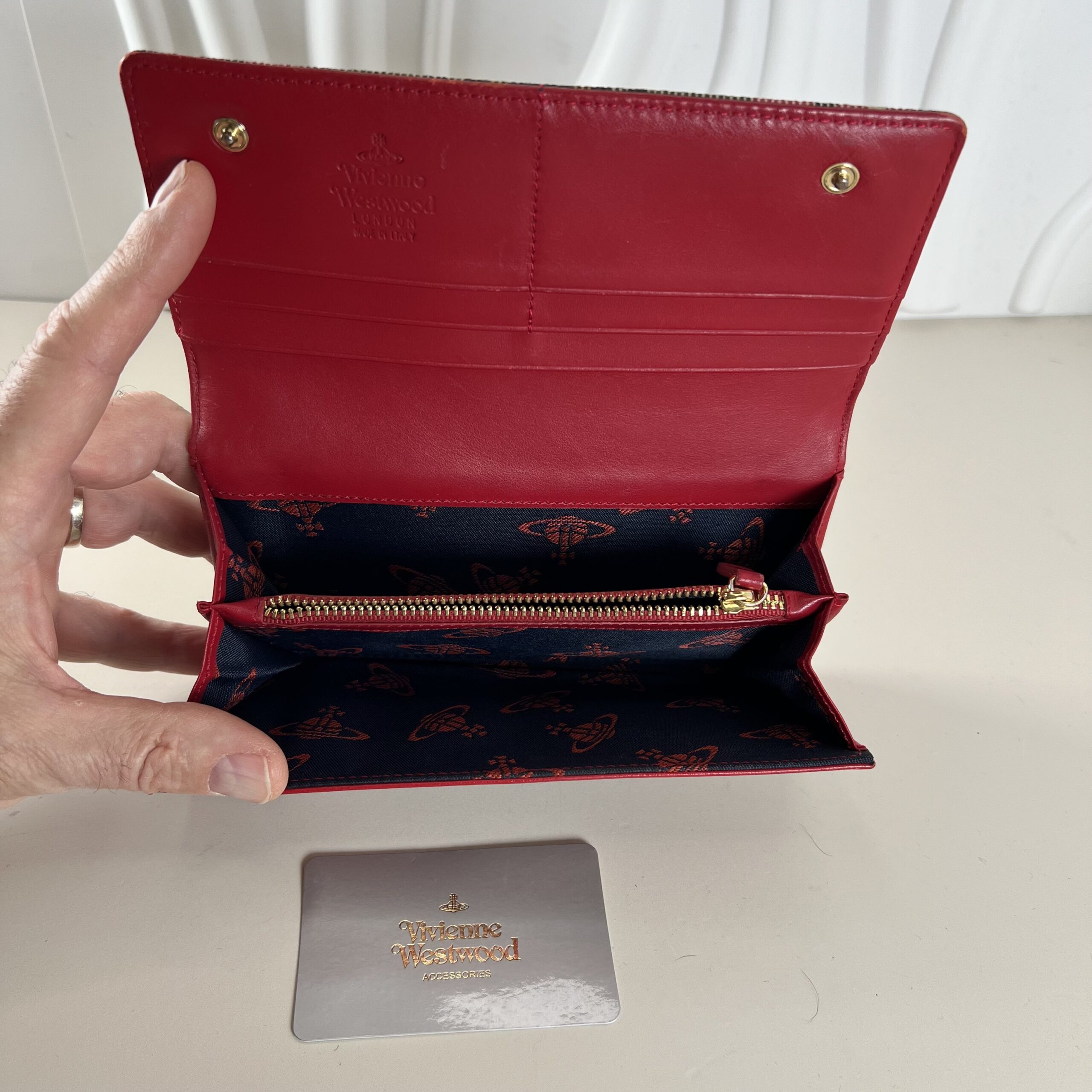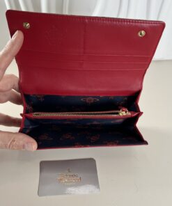 Designed in a continental long wallet silhouette, this piece opens to a well-organized interior offering multiple card slots, bill compartments, and slip pockets for everyday essentials. The structured profile allows it to function as both a daily wallet and an elegant clutch-style accessory. Durable construction and bold patterning make this wallet a timeless and recognizable Vivienne Westwood staple.